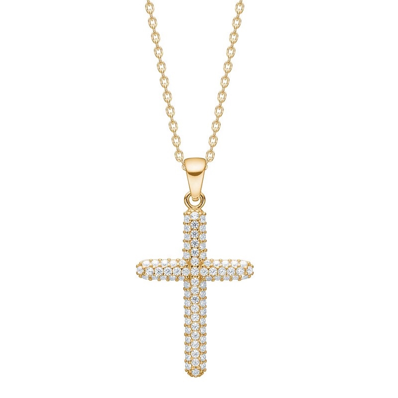 Der Anhänger ist aus 8 Karat Gold gefertigt und hat ein klassisches Kreuzdesign, bei dem klare zirkonia eng entlang der gesamten Form des Kreuzes eingefasst sind. Die gleichmäßige Steinfassung verleiht einen ruhigen und eleganten Ausdruck mit einem feinen Spiel im Licht.