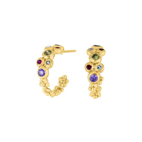 Die feinsten Creolen in einem barocken Design, in dem die feinsten farbigen Zirkonia sitzen. Creolen von Siersbøl für Nordahl Andersen, erhältlich sowohl in Silber wie hier als auch in vergoldetem Silber mit gebürsteter Oberfläche.
