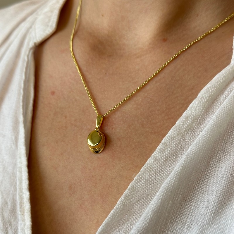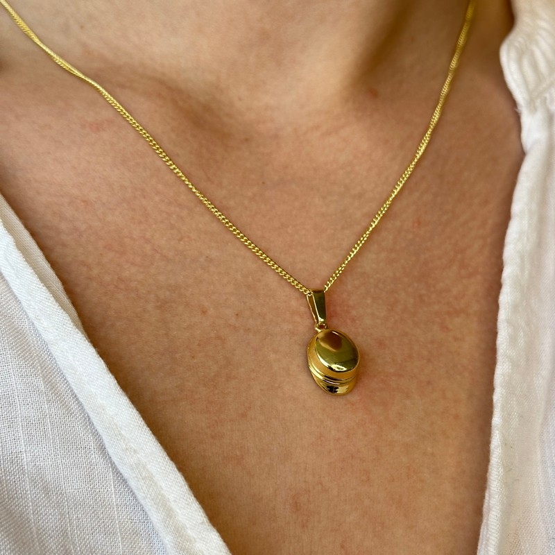 Die Kette ist aus vergoldetem Silber gefertigt und misst 45 + 5 cm.