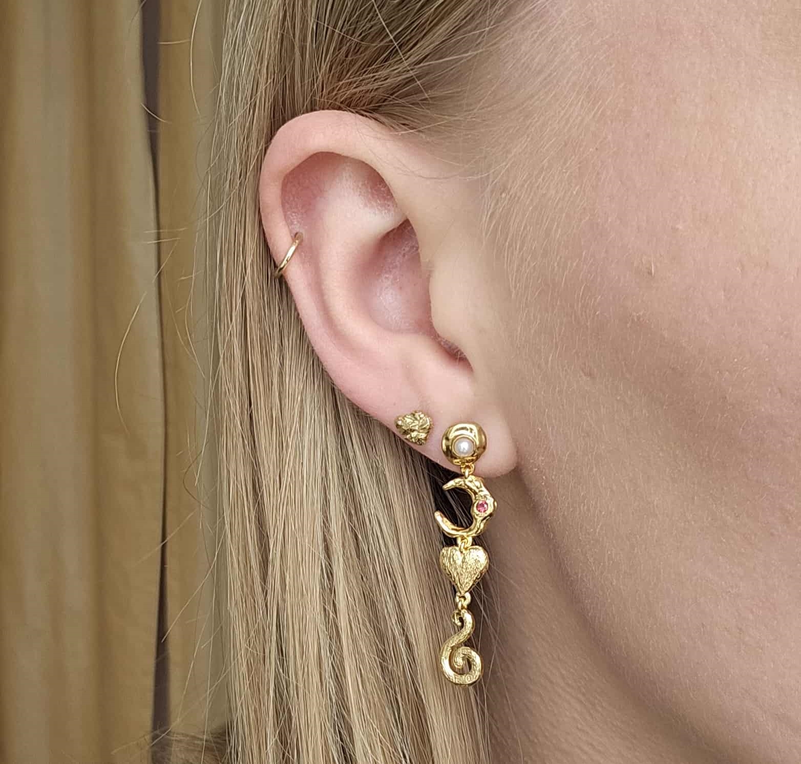 Die feinen Cascade-Ohrringe in vergoldete silber von Studio Z sind mit einer Reihe atemberaubender Elemente wie Herzen, Wirbeln, Monden und Zuchtperlen verziert. Darüber hinaus befindet sich in den Ohrringen auch ein wunderschöner roter zirkonia , der für ein unglaublich schönes Spiel sorgt.