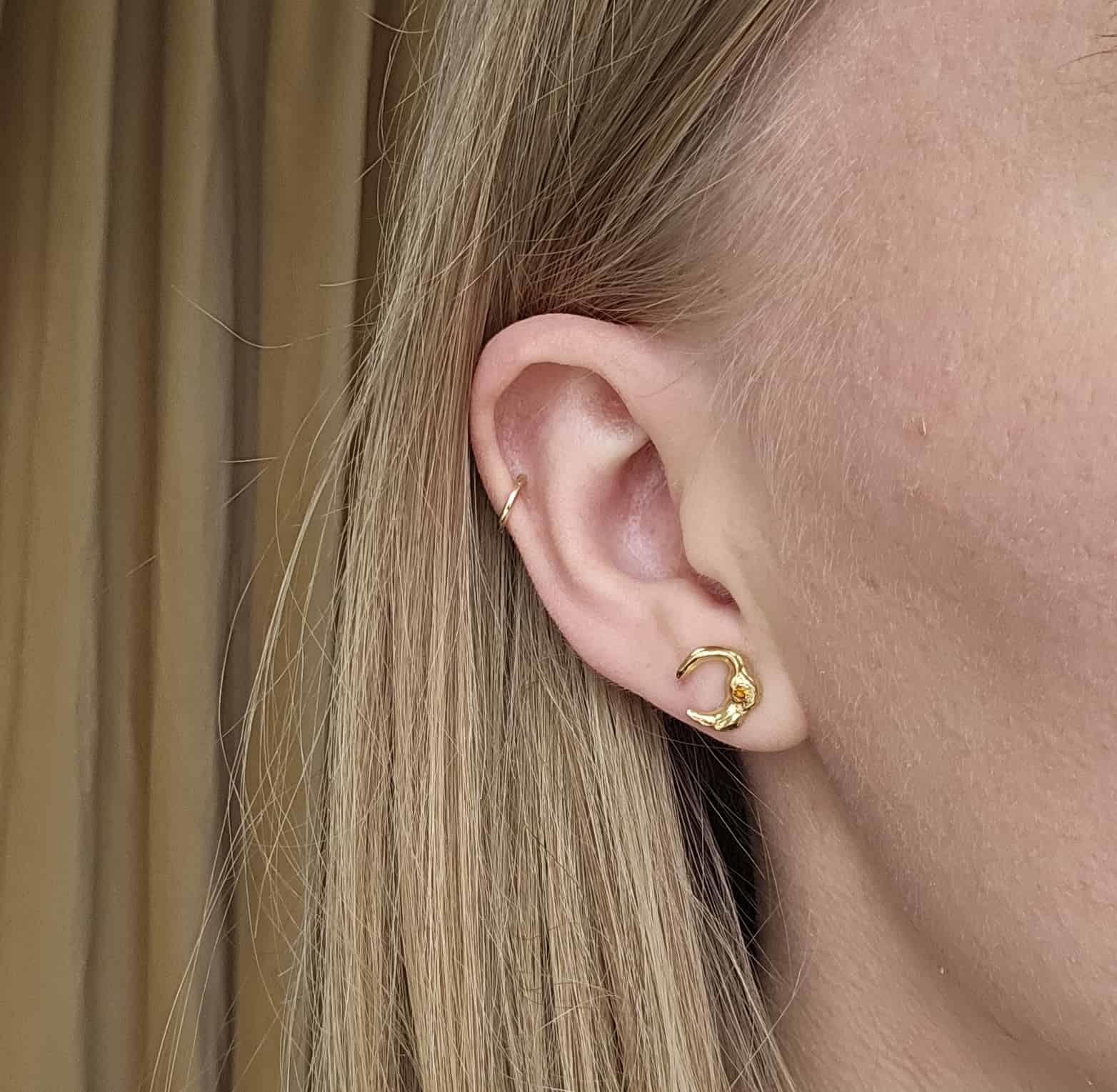 Die feinen Lunar-Ohrringe in vergoldete silber von Studio Z werden von einem wunderschönen Halbmond geziert, in dem ein glänzender orangefarbener zirkonia sitzt.