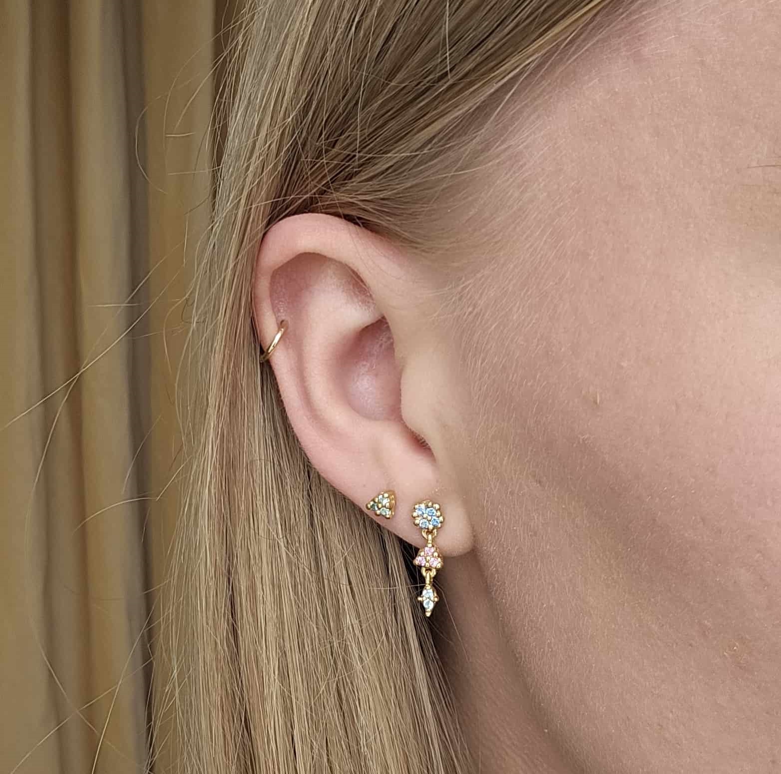 Wunderschöne Cluster-Ohrringe in vergoldete silber von Studio Z, mit blauen, grünen und rosafarbenen zirkonia. Die Ohrringe haben die klassische organische Form. Mit diesen Ohrringen heben Sie Ihren Stil garantiert auf ein neues Niveau.