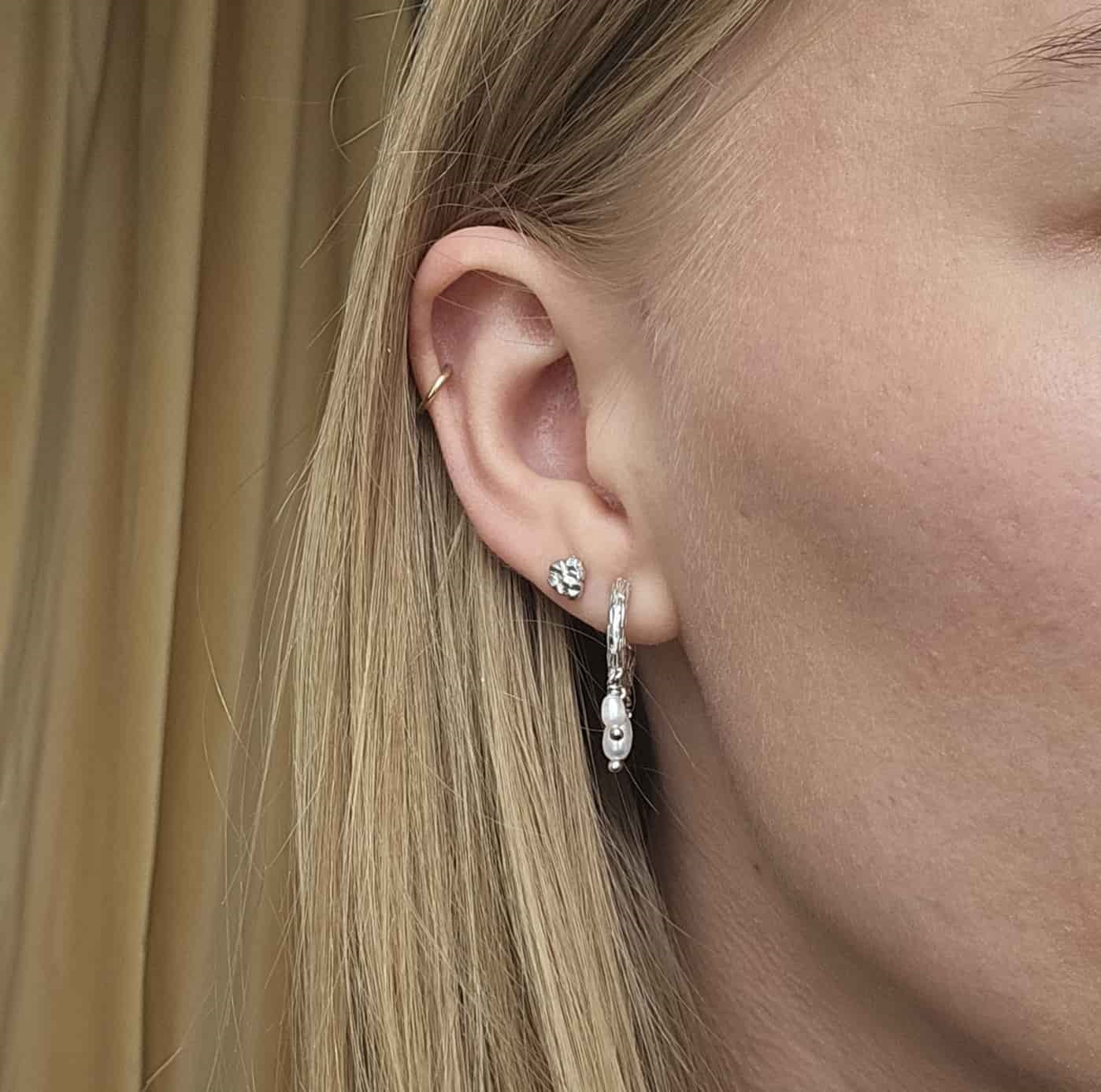 Twine Hoops in silber von Studio Z, mit Perlen. Die Ohrringe haben einen schönen organischen Ausdruck in der Form und haben 3 Perlen, die an jedem Reifen hängen.