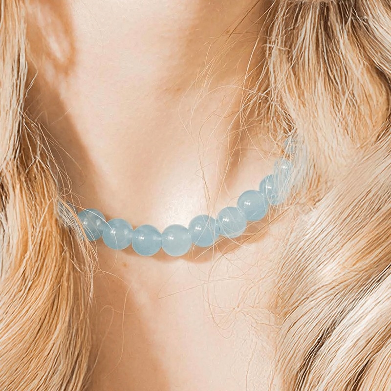 Die runden Perlen und der frische blaue Farbton verleihen der Halskette einen verspielten und stilvollen Ausdruck, der perfekt zu sommerlichen Outfits ebenso passt wie zu schlichteren Looks, bei denen das Schmuckstück im Mittelpunkt stehen darf.
