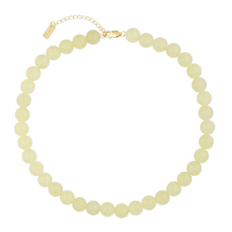 Die glatten Kristallperlen reflektieren das Licht dezent und verleihen der Kette einen eleganten, lebendigen Charakter, bei dem die Farbe sowohl mit hellen als auch mit dunklen Nuancen wunderschön harmoniert. Lemon wirkt besonders schön zu weißen, beigen und sandfarbenen Outfits, passt aber auch hervorragend zu Denim und Grüntönen.