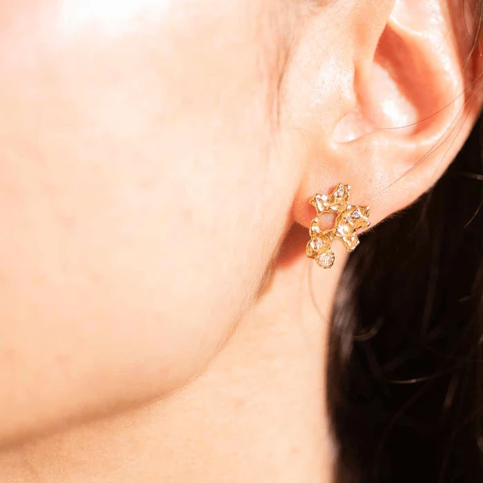 Die Ilium Ohrringe in vergoldetem Silber von House of Vincent sind für diejenigen geschaffen, die Schmuck mit natürlicher Eleganz und künstlerischen Details lieben. Das Design basiert auf organischen Formen und weichen Konturen, inspiriert von den Linien und Bewegungen der Natur. Dezente Steine sind in die Oberfläche eingefasst und fangen das Licht mit einem subtilen Glanz ein, was dem Schmuckstück einen raffinierten und harmonischen Ausdruck verleiht. Das Ergebnis sind Ohrringe, die es schaffen, sowohl zurückhaltend als auch charakterstark zu sein – perfekt für den Alltag und ideal für besondere Anlässe, bei denen Sie einen stilvollen, aber persönlichen Look wünschen.