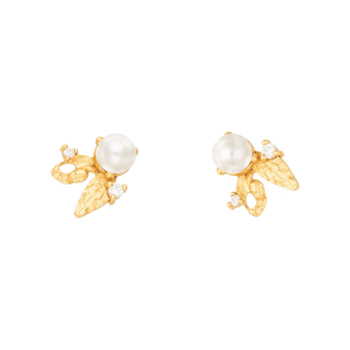 Venus Folia Ohrringe in vergoldetem Silber von House of Vincent. Die Ohrringe haben die schönsten runden weißen Perlen und klare Kristalle, die in die Oberfläche eingebettet sind. Vergoldete Ohrringe mit Blättern, Kristallen und Süßwasserperlen. Das Design ist von der Bewegung der Natur inspiriert und vereint Detail, Struktur und Weichheit in einem Ausdruck. Venus Folia wirkt feminin und raffiniert mit einem subtilen Glanz, der sowohl für den Tag als auch für den Abend geeignet ist.